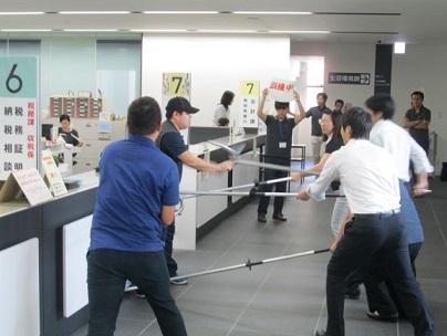 豊岡南警察署の協力を得て、不審者対応訓練を実施しました(1階の税務課窓口に不審者が現れたことを想定して、模擬訓練を実施しました)。訓練の様子を紹介します。