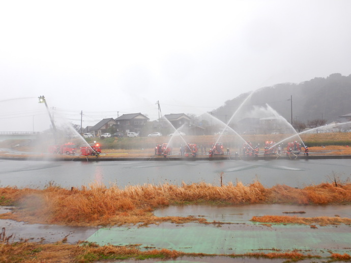 表彰では、消防庁長官表彰をはじめ、延べ51人の消防団員が表彰を受けました。また、最後は竹野消防団の全消防車両と、消防署のはしご車、ポンプ車も含めて合計8台での一斉放水を行いました。