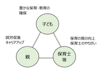 本事業では、この状態を改善するため、保育所等での「働きがい」や「働きやすさ」を高めることを通じて保育士等として働きたい人を増やし、保育の受け皿を拡大することで、待機児童の解消を図ることを目的としています。