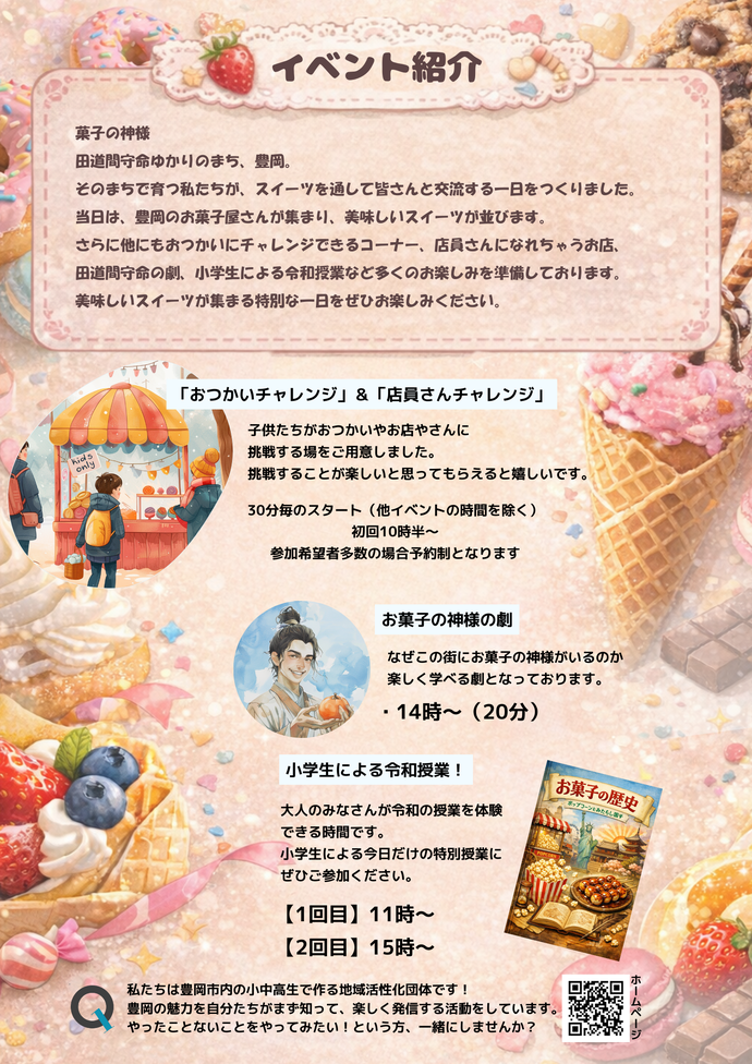 市内の小中高生で構成する地域活性化団体「Q’s」が企画・運営するイベント「とよおかスイーツ祭」を開催します。