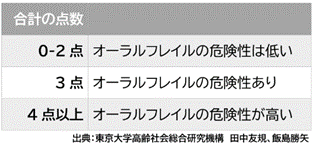 合計点数の高かった方も、そうでなかった方も、オーラルフレイルが進行しないように、口のケアに取り組みましょう。