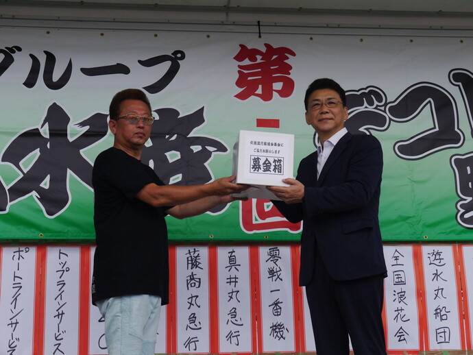 沙弥嘉丸水産株式会社から第2回デコトラ野郎祭の収益金をいただきました