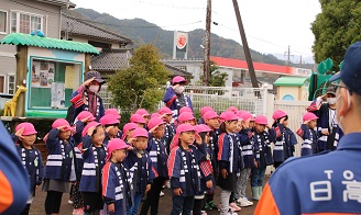 秋の火災予防運動の一環として、11月9日に「幼児防火パレード」を実施し、日高幼稚園・蓼川保育園の園児のほか、日高消防団員の方々と豊岡消防署 日高分署の職員が参加しました。