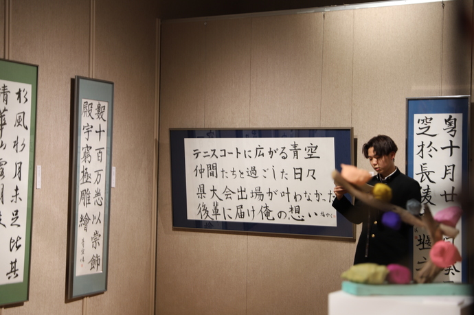 書〔漢字仮名交じりの書〕の部のギャラリートークでは、総合体育大会での思い出やアルバイトでの出来事など高校生活の中で経験した出来事の場面を表現した作品が多くみられました。