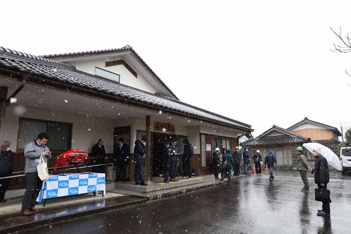 斎藤兵庫県知事や関貫市長らが見守る中、郵便局から離陸したドローンは公民館に向かって飛び立ちましたが、この日は雪交じりの悪天候だったため、途中で飛行を中止しました。唐川公民館ではドローンの着陸と、住民が荷物を受け取るデモンストレーションを行いました。